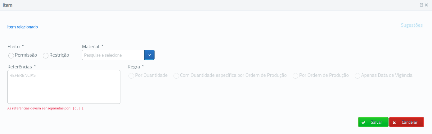 Controle rigoroso sobre as permissões de uso de materiais e componentes, com base em normas de qualidade, especificações do cliente ou diretrizes internas. Permite autorizar ou restringir o uso de determinados insumos, conforme a necessidade.