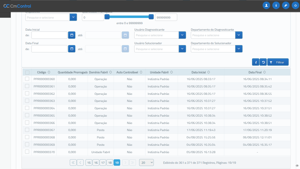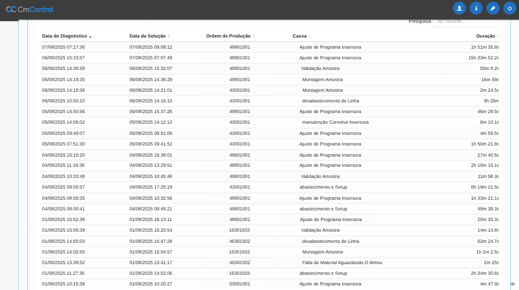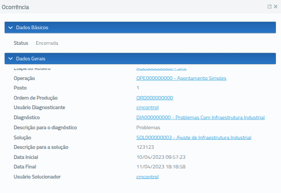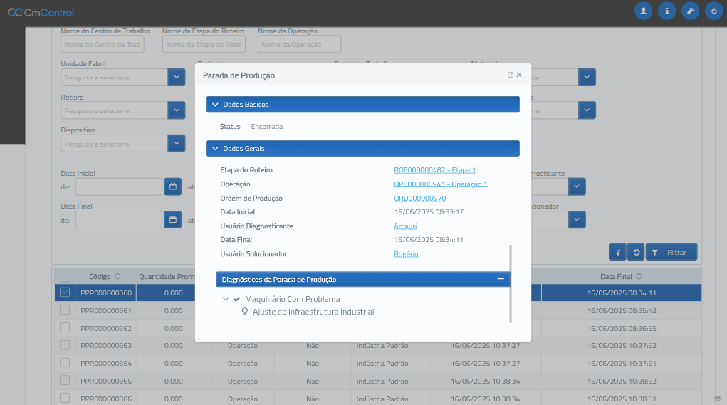Gestão de eventos inesperados no processo produtivo, como falhas, desvios, acidentes ou não conformidades, com rastreio e tratativas.