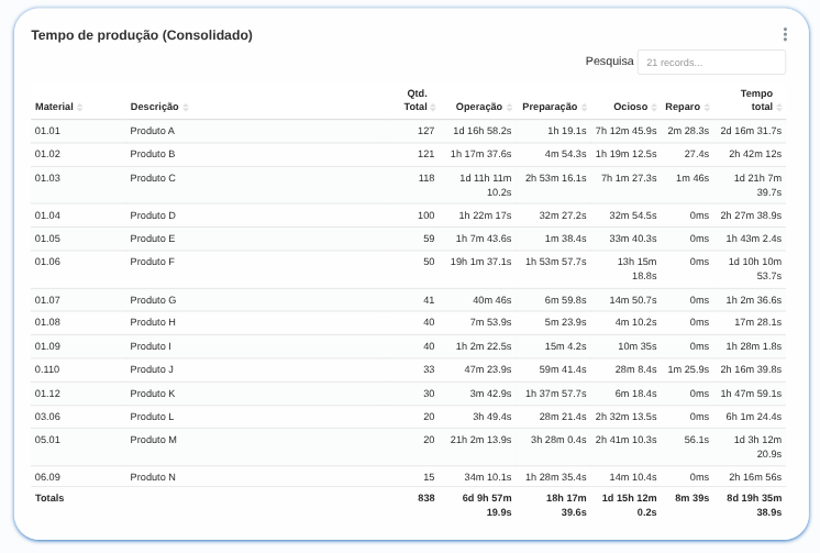 - Permite análise rápida da produtividade e eficiência por turno, célula ou equipe.